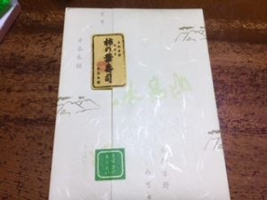 柿の葉寿司です。シャケ、タイ、アジ、サバの4種類だったと思います。