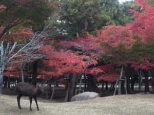 夕暮れ時、紅葉と鹿が、とってもいい感じでおさまっていて、自分自身のお気に入りの一枚です。写真センスも、絵心もありませんが、ちょっといい感じに 撮れたんじゃない?と、自己満足です(笑)